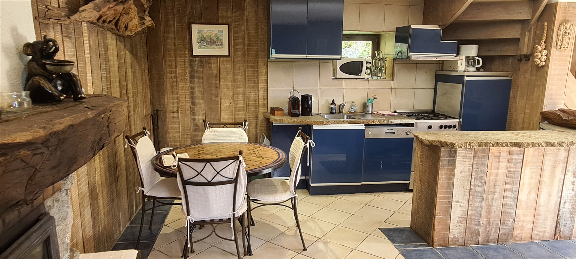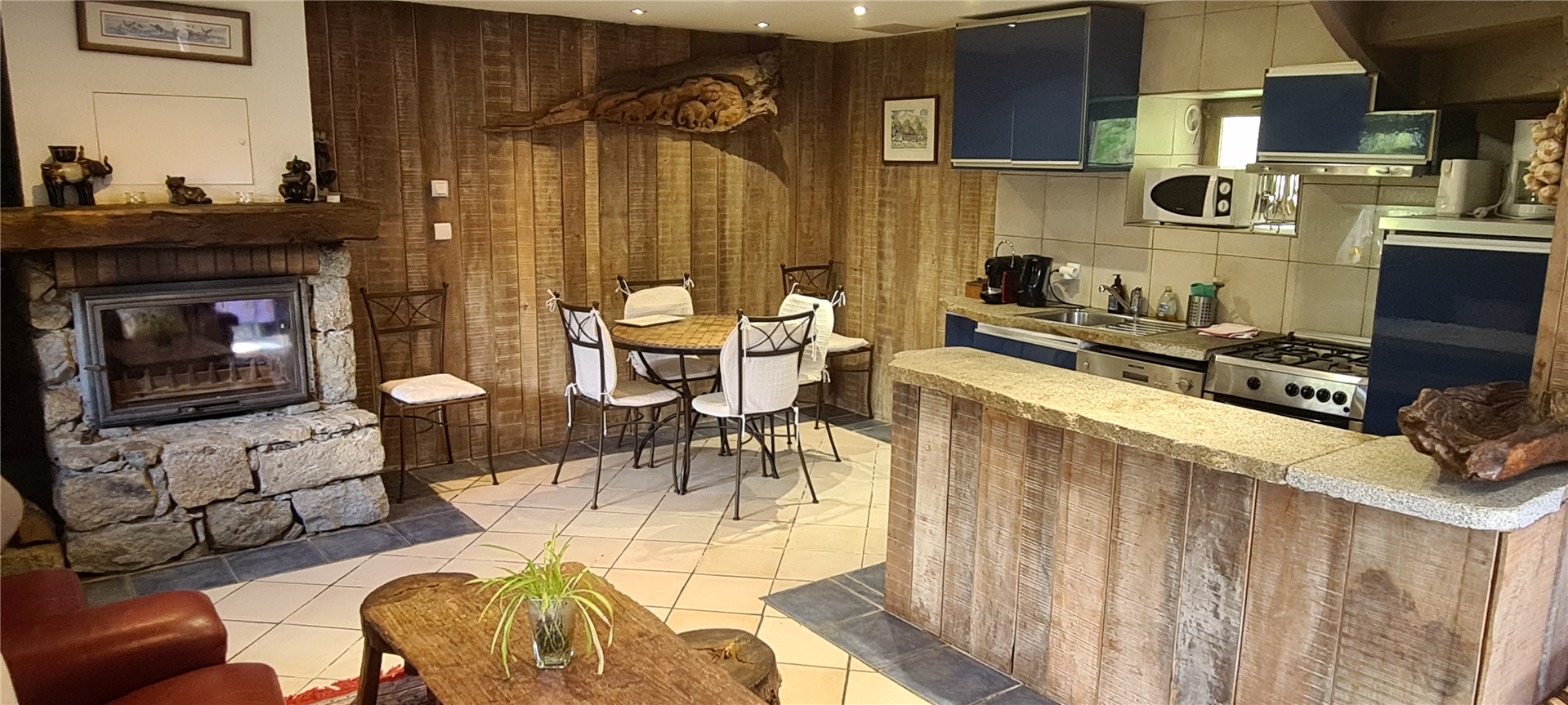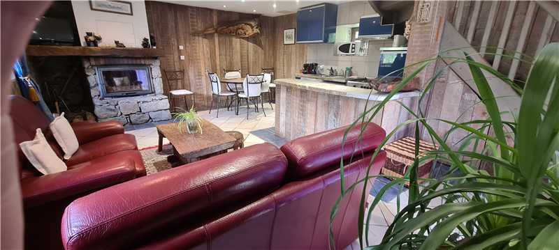 - A spacious living room with fireplace and wood-burning insert heating the entire house. Armchairs, leather sofa, satellite TV with international channels and DVD player with a film collection for all ages.