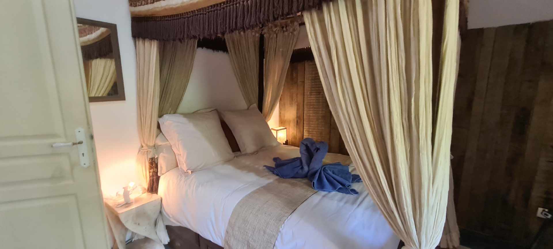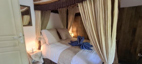 - One bedroom with a 140 cm four-poster bed.